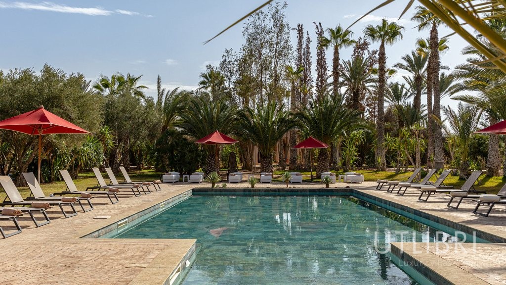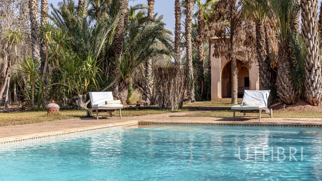 Bassin large chauffé l’hiver, bordé par les tentes berbères.