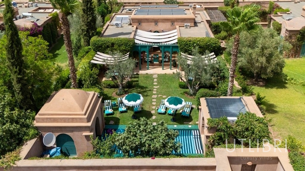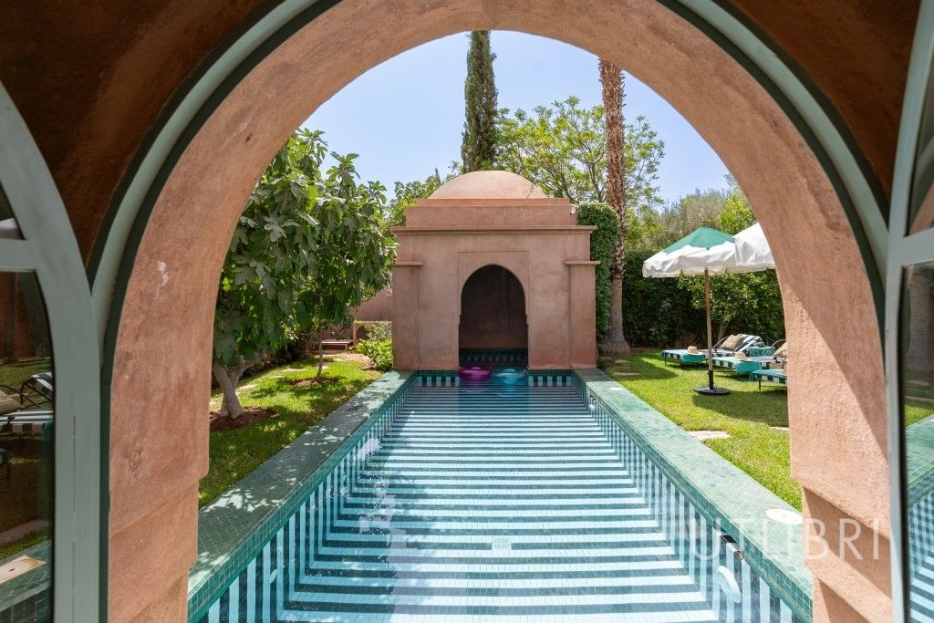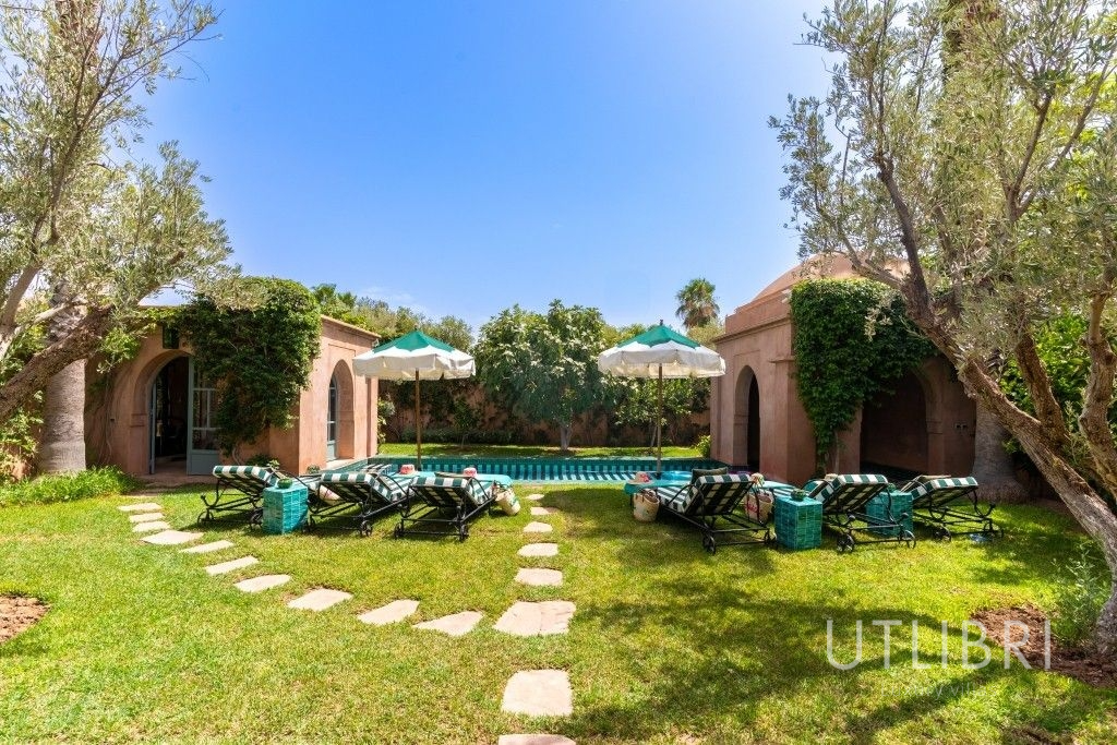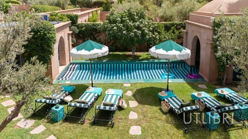 À seulement 30 minutes de l’effervescence de Marrakech, nichée dans un domaine privé aux abords du désert et de la palmeraie, la villa Caldo vous invite à une parenthèse enchantée, où le raffinement contemporain dialogue avec l’âme marocaine. Derrière ses murs ocres, cette villa d’exception de 600 m² incarne un art de vivre chaleureux, inspiré de la tradition locale et sublimé par le talent du designer Baptiste Bohu. Pensée pour accueillir jusqu’à 8 personnes, la demeure se compose de trois chambres élégantes, chacune avec salle de bain privative, climatisation, dressing et terrasse et d’espaces de vie généreux : un vaste salon aux inspirations orientales, une salle à manger conviviale, une cuisine semi-professionnelle, une bibliothèque, un espace de yoga et de méditation, ainsi qu’un spa comprenant hammam, salle de massage et salle de sport entièrement équipée. Un canapé convertible double dans le salon et un lit supplémentaire dans l’une des chambres permettent d’accueillir confortablement familles ou groupes d’amis. Au cœur de la maison, le patio central pavé de carreaux bejmat verts et blancs capte la lumière et crée une atmosphère apaisante. À l’extérieur, le jardin luxuriant dévoile une palette de senteurs et de couleurs : jasmin, orangers, bougainvilliers… La piscine chauffée en zelliges noir et blanc (12 x 3 m) invite au farniente, entourée de transats et de parasols. Sous la pergola, l’espace repas extérieur accueille vos grandes tablées dans une ambiance détendue. Un terrain de tennis partagé, accessible gratuitement, est également à disposition : raquettes et balles fournies, réservation possible via le majordome. La qualité du service complète l’expérience unique de la villa Caldo. Un majordome et une femme de chambre/cuisinière résident sur place pour assurer un confort absolu. Le petit-déjeuner est inclus, et pour les autres repas, une formule « à la carte » vous est proposée, sans souci de courses ou de préparation (déjeuner à partir de 300 MAD, dîner à partir de 400 MAD – tarif enfant avantageux). La villa bénéficie d’un emplacement idéal : à proximité immédiate de Marrakech, tout en offrant une tranquillité absolue. Depuis ce cocon de sérénité, partez à la découverte des trésors de la Ville Rouge, les souks animés, les palais somptueux, les jardins luxuriants ou explorez les environs : golfs de renom, balades à cheval ou à dos de dromadaire, villages berbères empreints d’authenticité, et bien sûr, la majesté des montagnes de l’Atlas, toujours en toile de fond. Entre luxe discret, hospitalité marocaine et beauté naturelle, la villa Caldo est bien plus qu’une maison de vacances : c’est une expérience à vivre, une émotion à partager.