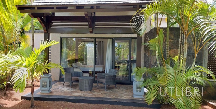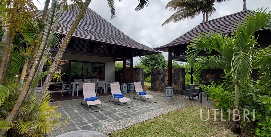 La varangue côté mer avec son salon extérieur et son kiosque convivial près du BBQ, idéale pour profiter de la douceur mauricienne du matin au soir.