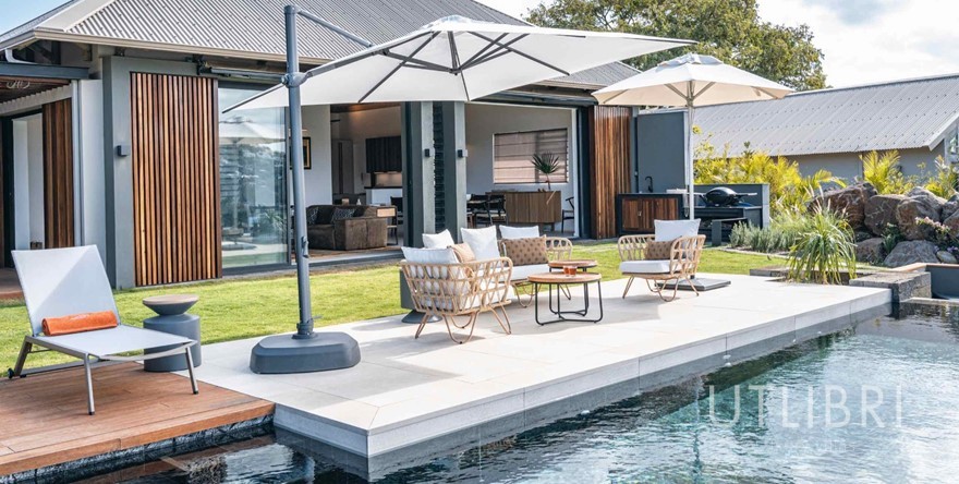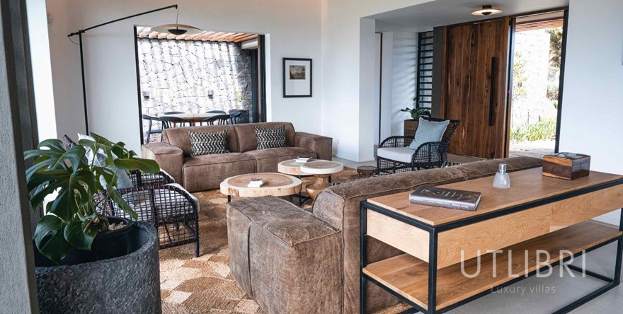 Le coin brasero attenant à la piscine, où profiter du feu face à l’océan crée des soirées absolument uniques.